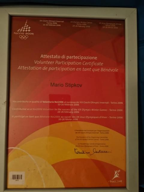Winter Olympics Torino 2006 Volunteering Certificate.